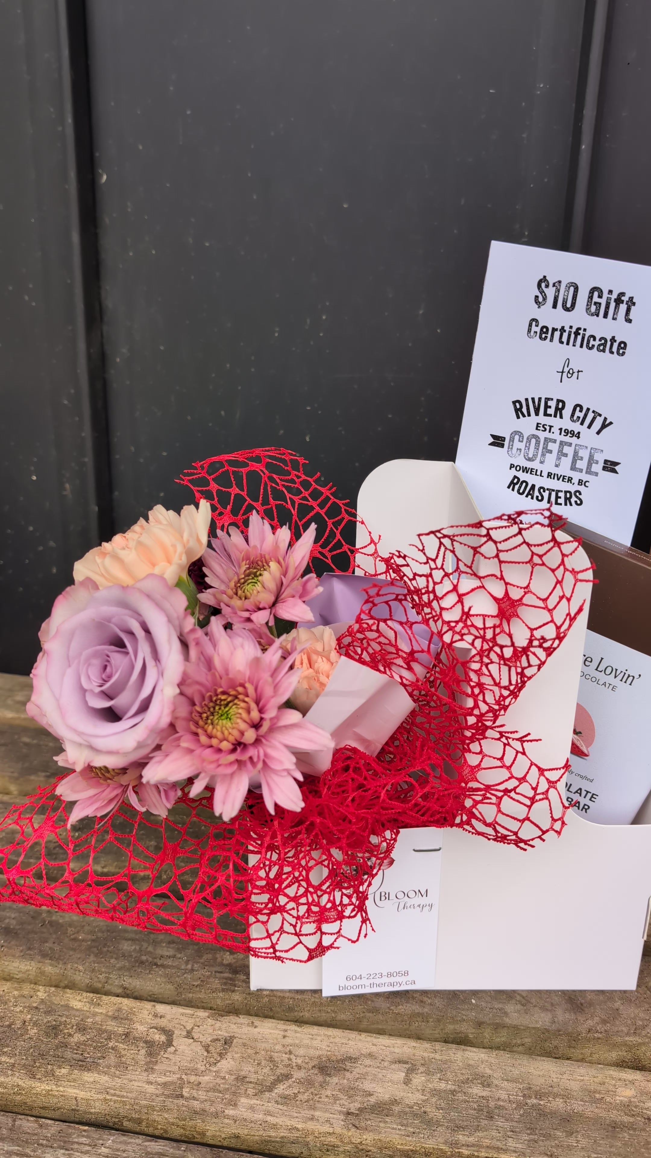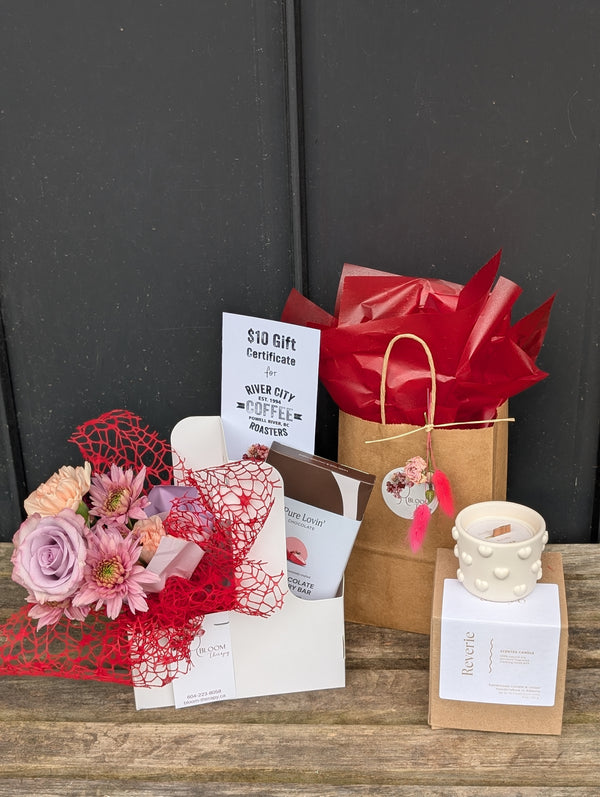 The flower posy will be filled with the freshest flowers of the season, local + BC grown when possible, and sweetly wrapped in coordinating colours. The flowers will be complimented with a gift certificate that the recipient can use any time they want at River City Coffee Roasters, and a bar of handmade vegan organic chocolate from Vancouver Island small maker Pure Lovin'. All of this is packaged in a cute take-away coffee box. On the side, and packaged beautifully but separately is and a Canadian-made adorable soy candle made in a ceramic vessel that is embossed with tiny hearts.
